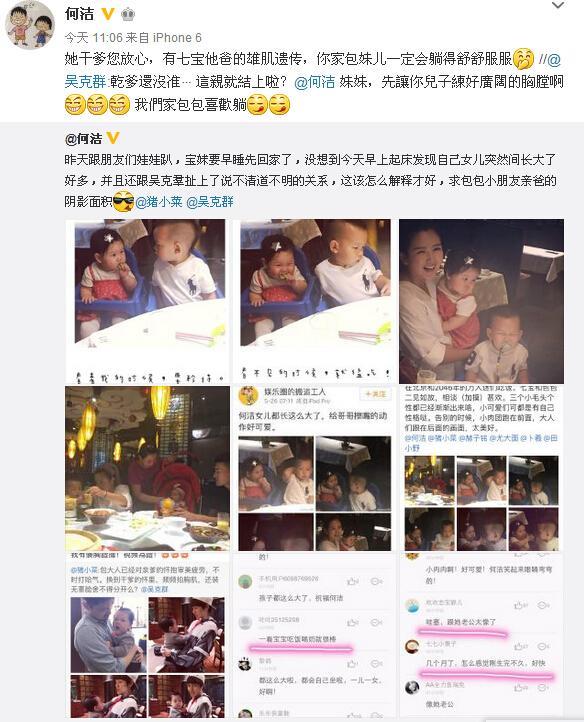 5月26日,何洁微博晒出一组照片,调侃道:“昨天跟朋友们娃娃趴,宝妹要早睡先回家了,没想到今天早上起床发现自己女儿突然间长大了好多,并且还跟吴克羣扯上了说不清道不明的关系,这该怎么解释才好,求包包小朋友亲爸的阴影面积”并@吴克群 @猪小菜(何洁二胎女儿曝光了?2015年11月7日上午,赫子铭发长文感谢妻子何洁产下二胎女儿宝妹,由于何洁赫子铭甚少放出女儿照片,不少网友好奇宝妹正面照长得什么样子。)