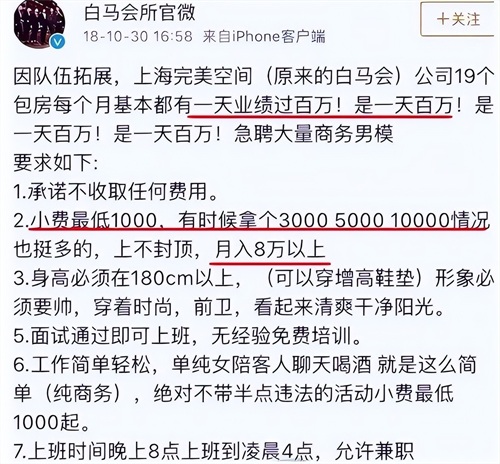 因为业务扩张需要,白马会还曾在网上发过招聘通知,福利待遇简直让人眼红,承诺“小费最低1000元,上不封顶,月入8万以上”,还说工作简单,只是“陪女客人喝酒聊天,纯商务,不带半点违法活动”,招聘对象要求在180cm以上,形象必须要帅,并称之为“商务男模”,网上冲浪的人懂的都懂,说这里面没有猫腻谁信呢。