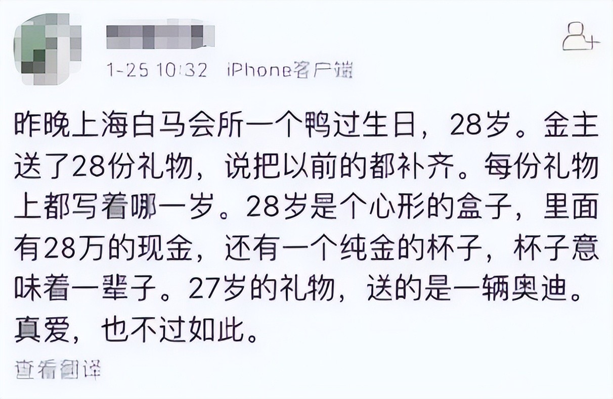 “网传的过生日事件是真的,但这种情况在会所内太常见了,几乎每个老顾客都有固定的男伴,像照片中的生日礼物根本不算什么,比这高档的礼物太多了”