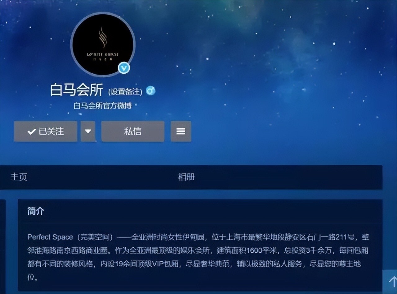 它在全国数十个城市有几百家门店,每个服务行业对应的品牌名称不同,而“白马会所”正是其中夜总会的品牌名字,在全国也开设了多家分店,后来感觉太过高调,改成了“完美空间”,不过品牌形象和LOGO都没有变,老顾客还是习惯称呼为“白马会所”,官网和官方账号的名称也是用白马会所一直延续下来。