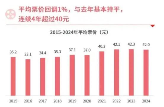 从数据调查来看,猫眼研究院发布的《2024中国电影市场数据洞察》显示,2024年电影总票房达425.02亿元,总票房体量与2015年相当,同比下降23%。观影总人次为10.1亿,近10年场均人次震荡下降。此外,电影平均票价回调1%,与2023年基本持平。值得关注的是,电影平均票价连续4年超过40元。2022年以来,电影平均票价一直处在超过42元的“高位”。