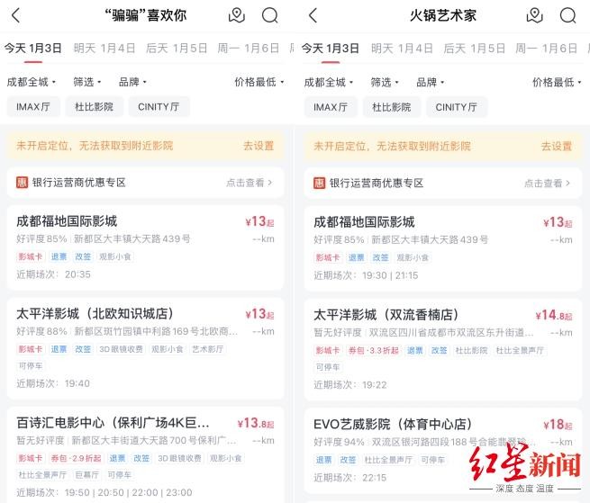 1月3日,微成都记者查询猫眼平台获悉,成都ACTO梦空间影城(成都四季城店)、嘉莱炜岸国际影城、太平洋影城(彭州丹郡兰庭店)等多家影院两部电影均定价为19.9元/人次。根据影城和场次不同票价浮动较大,最低票价仅13元/人次,与最高价相差近40元。在“19.9元票价”的加持下,《“骗骗”喜欢你》在元旦档期内也取得了4163.8万的票房成绩,仅次于《误杀3》和《小小的我》。