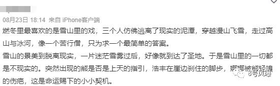 后来又有声音起来说《燃冬》不差,又是长长的评论,总结就是如果你只把它当成爱情片来看,就没有看懂导演的用心良苦,这么好的文艺片不应该被埋没。