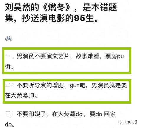 网友生怕有更多文艺片被拉出来比较,警告《燃冬》的粉丝们," 别把文艺片当烂片遮羞布 "," 碰瓷顶级文艺片也改不了是部烂片的事实 "。