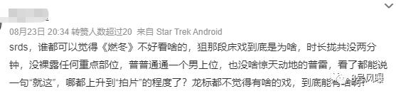 《燃冬》宣发时,也一直用几场激情戏作为噱头,只是没想到印象最深,吐槽也最多," 没有性张力 "," 油腻 "," 看完只想换一双没看过的眼睛 "。