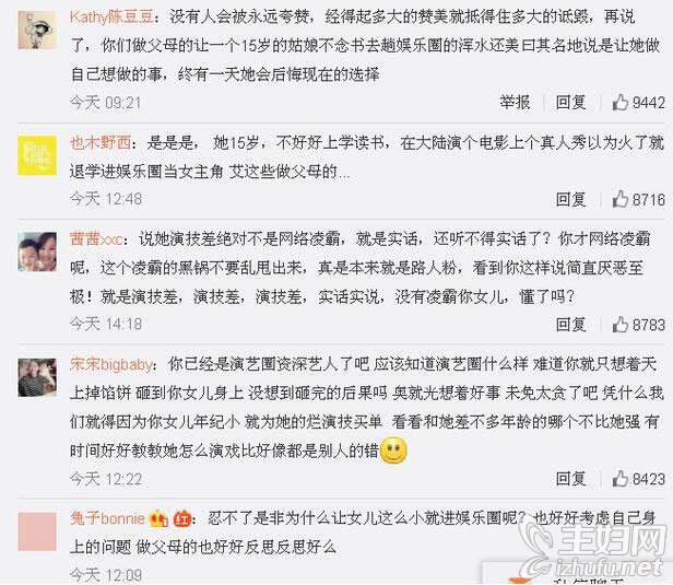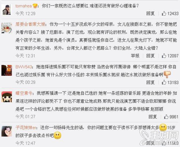 有微博名为居委会首席大娘留言:这么想要女儿红,难道不要做些准备吗?接了烂剧本,演了烂戏怪谁,要怪就是十五岁没成年少女的母亲没有把关好。
