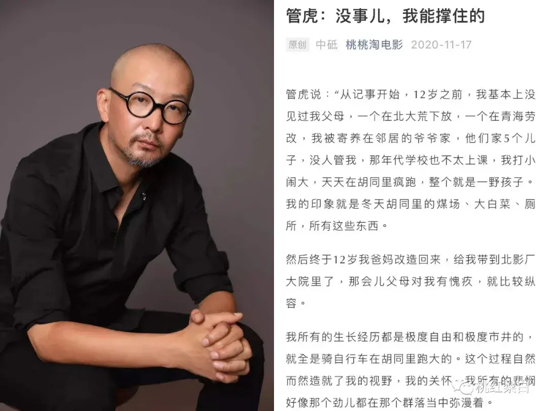 12岁之前,管虎基本没跟父母一起生活过,天天在胡同里疯跑,记忆最深的是北京冬天的煤场、大白菜、厕所……