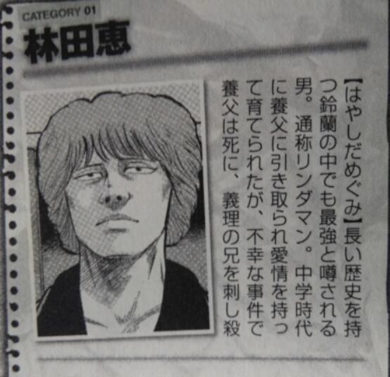 主要战绩:转学到铃兰后打败了当时最大的对手芹哲,在第二部中又打败了凤仙的BOSS 鸣海大我,漫画里基本上打赢了整个城市其它所有学校的老大。