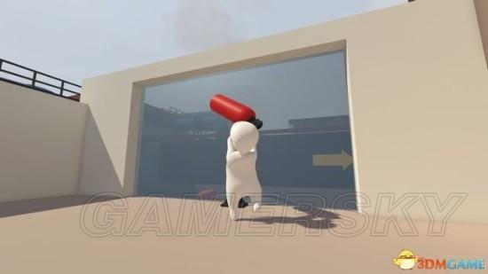 双手将墙角的灭火器举高高冲向落地窗,即可将落地窗砸碎来到屋外。