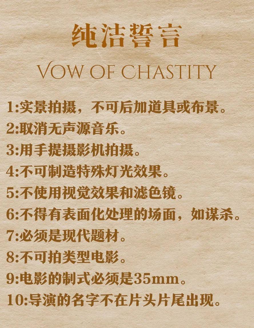 1995年,丹麦导演拉尔斯·冯·提尔(Lars von Trier)和托马斯·温特伯格(Thomas Vinterberg)共同签署了“道格玛95宣言”(The Dogme95 Manifesto),掀起一场“净化”电影业的运动。他们提出极简主义的拍摄手法,并给出了道格玛电影必须遵循的十条规则(又被称为纯洁誓言,Vow of Chastity),可以说影响了一代的独立电影人。
