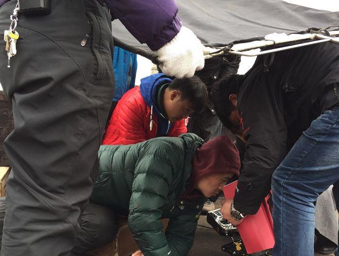 《伪装者》幕后花絮,这张是导演李雪在为演员试戏,大冬天,趴在地上。