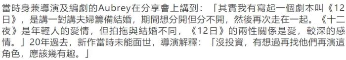 《12夜》对香港观众来说亦是一部经典佳作,导演兼编剧林爱华也对这部电影投入了很深的感情,2020年香港院线还举办过港片20周年重映活动,林爱华也在现场,当时她就提到了续作《12日》想找原班人马出演,可却没有投资,一直未能面世。