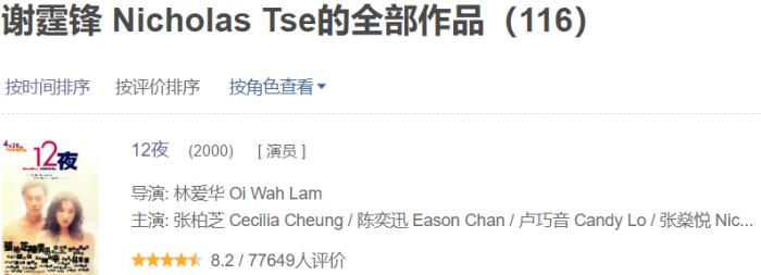 虽然《12夜》这部电影比较冷门,但口碑却相当不错,豆瓣评分8.2,是张柏芝主演电影中豆瓣评分第三高的一个,更是谢霆锋参演过的评分最高的电影。