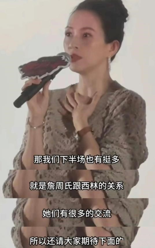 结果,章子怡笑着替她接了话:“我们下半场也有挺多詹周氏跟西林的关系,她们有很多交流,所以还请大家期待下面的。”