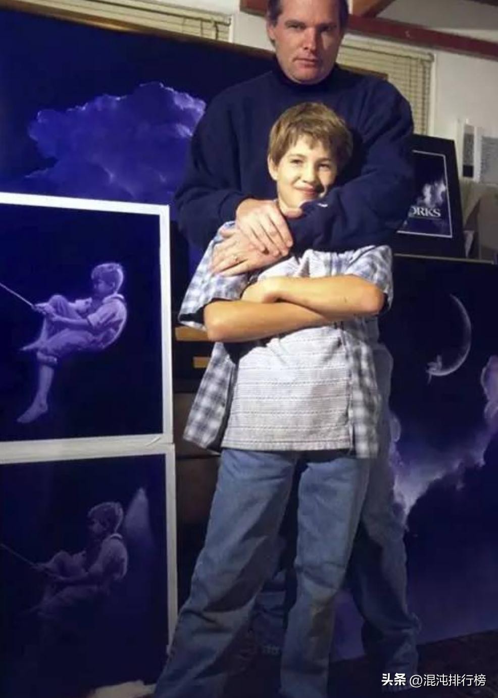 起初,斯皮尔伯格设想的梦工厂Logo是让一个成年男子坐在月亮上垂钓,并用电脑合成的手段将这幅画面展现出来。但是他的老搭档、工业光魔的视效总监丹尼斯·穆伦却觉得手绘标识可能是更为理想的选择。于是,穆伦便请来了他的画家朋友罗伯特·亨特帮忙。有趣的是,亨特在为梦工厂绘制Logo时,也迸发了新的想法,所以他一口气创作出了两个版本,一版遵循了梦工厂的要求,而另一版则将垂钓的男人换成了小男孩儿。至于Logo提交的结果,大家看到的梦工厂片头已经给出答案啦,斯皮尔伯格显然对那个男孩情有独钟。至于那个坐在弯月上被万人瞩目的幸运儿,他就是亨特的儿子威廉。
