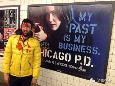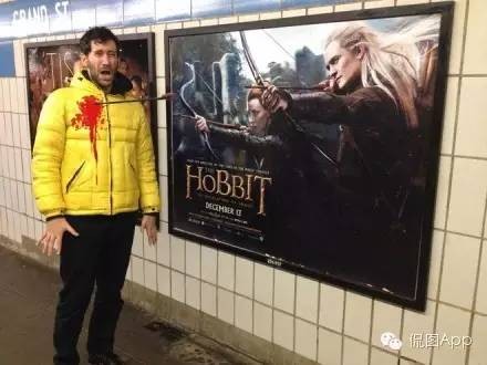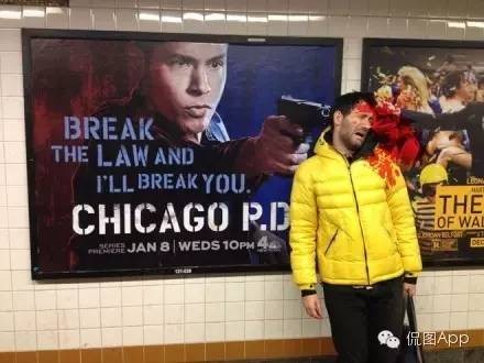 这位这么有创意的“逗比”大神,其实是英国艺术家乔恩·伯格曼,他的instagram帐号(@jonburgerman)里,好多创意作品,比如最近他就结合地铁车站墙壁上的各种知名动作电影海报,拍摄了一系列被电影角色射杀的照片,角度恰当自然,逼真的样子似乎让人觉得更加搞笑。