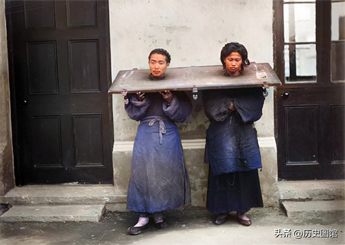 照片里,一名男子和一名女子站在墙根处,他们共同戴着一个巨大的木枷板。由于太沉重,男子用手托着木板。原来,他们就是杨乃武和小白菜。