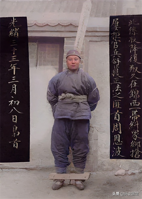 这张照片里,一名男子胳膊绑在身后,脚上戴着木枷,背后插着一根亡命牌。照片两侧有详细的文字说明。