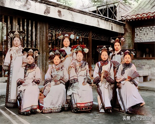 这张照片不是剧照,是真实的清朝老照片。照片中8名长相清秀、端庄娴淑的女子,正是皇宫里的妃子。