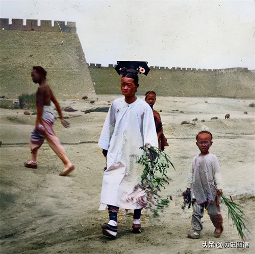 她的孩子跟在身后,手里拿着香草。她是一名旗人女子,装束很有特点,一眼就能看出来。