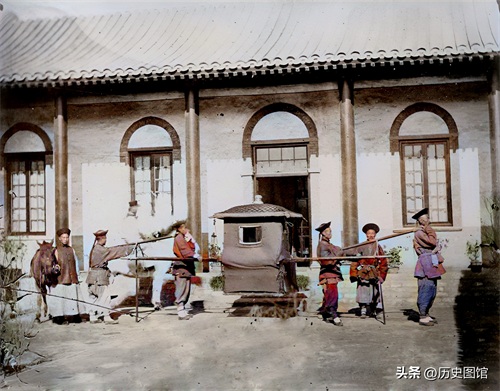 清朝时期,一名官员出行时的情景。四名轿夫抬着一顶轿子,在门口等候。还有骑马的随从。在清朝时期,只有三品以上的官员才有资格乘坐轿子。
