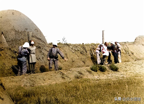 晚清时期,两名义和团士兵被英军抓住,将他带到刑场执行枪决。两人被蒙着眼睛,双手的双腿被绑在一根立柱上,身后有一人高的土墙。