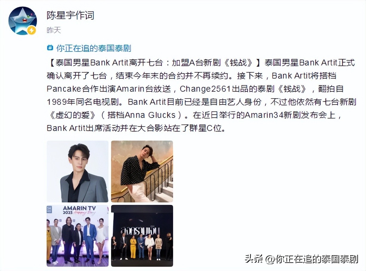 【泰国男星Bank Artit离开七台:加盟A台新剧《钱战》】泰国男星Bank Artit正式确认离开了七台,结束今年末的合约并不再续约。接下来,Bank Artit将搭档Pancake合作出演Amarin台放送,Change2561出品的泰剧《钱战》,翻拍自1989年同名电视剧。Bank Artit目前已经是自由艺人身份,不过他依然有七台新剧《虚幻的爱》(搭档Anna Glucks)。在近日举行的Amarin34新剧发布会上, Bank Artit出席活动并在大合影站在了群星C位。