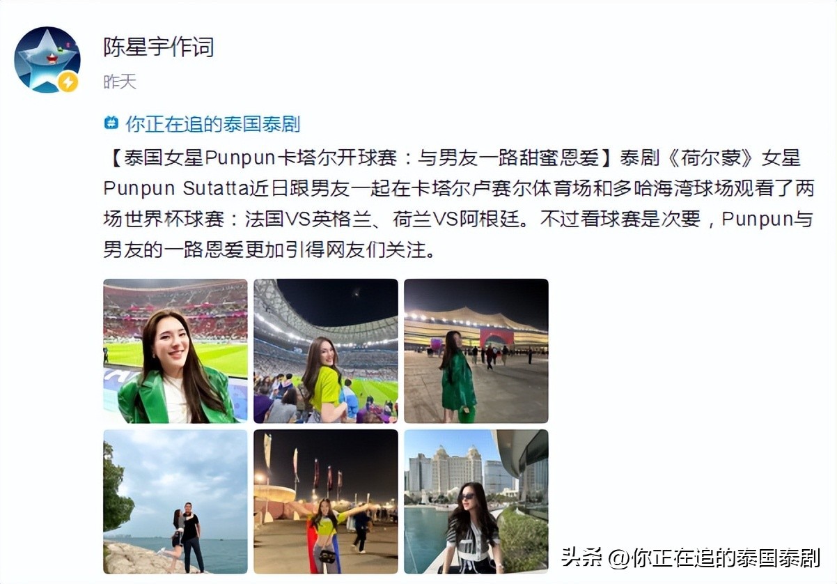 【泰国女星Punpun卡塔尔开球赛:与男友一路甜蜜恩爱】泰剧《荷尔蒙》女星Punpun Sutatta近日跟男友一起在卡塔尔卢赛尔体育场和多哈海湾球场观看了两场世界杯球赛:法国VS英格兰、荷兰VS阿根廷。不过看球赛是次要,Punpun与男友的一路恩爱更加引得网友们关注。