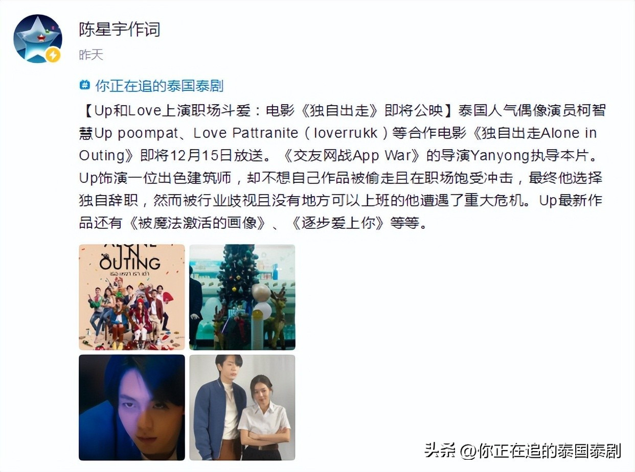 【Up和Love上演职场斗爱:电影《独自出走》即将公映】泰国人气偶像演员柯智慧Up poompat、Love Pattranite(loverrukk)等合作电影《独自出走Alone in Outing》即将12月15日放送。《交友网战App War》的导演Yanyong执导本片。Up饰演一位出色建筑师,却不想自己作品被偷走且在职场饱受冲击,最终他选择独自辞职,然而被行业歧视且没有地方可以上班的他遭遇了重大危机。Up最新作品还有《被魔法激活的画像》、《逐步爱上你》等等。