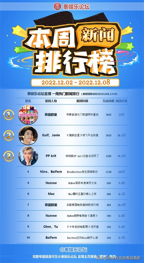 【泰国娱乐圈本周最热十大新闻排行榜:快看看你的爱豆上榜了吗】热点新闻人物No.1《中泰旅游大门有望明年重启》;热点新闻人物No.2:gulf kanawut、Janie 《泰剧情牵巨星网飞平台热播》;热点新闻人物No.3《林祎凯PP krit记者会后哭了》;本周热点新闻人物还有Naphat_nine、Baifern吕爱惠、Mac、王嘉尔、林景云NuNew、ohmpawat 、Tu Tontawan等等。
