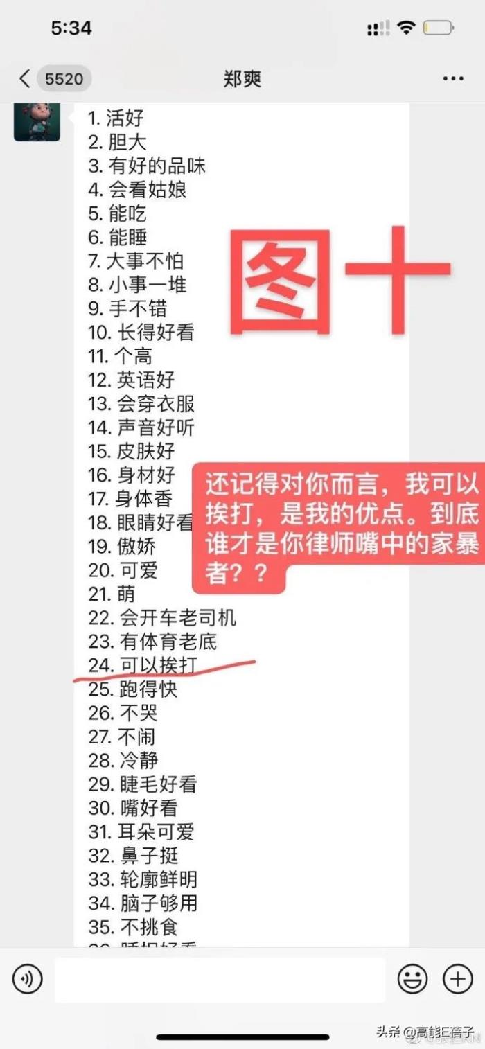 值得一提的是,张恒还晒出了一张郑爽列举张恒的优点的聊天记录,其中有一条“可以挨打”被张恒着重圈出,张恒表示郑爽才是喜欢施暴的那个人。