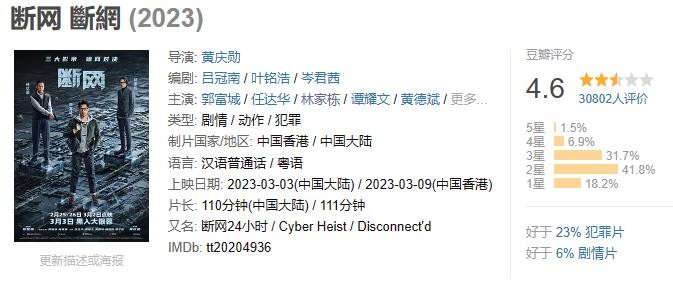 《断网》由黄庆勋导演执导,主演有大家熟悉郭富城,任达华,林家栋,谭耀文等。本片讲述郭富城饰演卓家俊意外陷入一起网络金融犯罪的巨大阴谋,不得不在有限的时间与黑白两道展开一场实力悬殊的暗网对决,看简介其实还有点看头的,但实际上简直吓了我一跳,一个字“乱”由头到尾不知道在干什么,网络上也是遭到一遍网友骂声,可谓惨到冰点。目前网络上已上映,