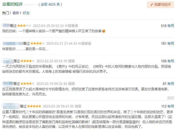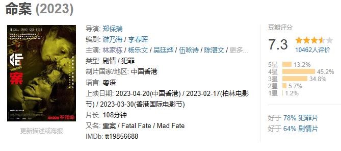 《命案 2023》由导演郑保瑞执导,不用多说这位大导演相信大家都熟悉,前一部《智齿》黑白风格可谓相当炸裂,拍悬疑还得是他。本次新作由林家栋,杨乐文,吴廷烨,伍咏诗,陈湛文等主演,东莞仔的演技就不必多说,新人演技也得到了观众一致好评,一个字“爽”。本片讲述命理大师(林家栋饰)帮人化解命运导致一系列扑朔迷离的故事,突出人类最大的悲剧:一切皆是命,半点不由人?注:新片网络已经有资源,可下载可在线观看。