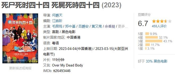 《死尸死时四十四》由导演何爵天执导,这位导演执导还有一部名为《正义回廊》,这部片也是相当火爆,相比于《毒舌律师》,《正义回廊》还有略胜一筹,大家不妨去观摩观摩。本片主演有大家熟悉的毛舜筠,郑中基,作为一部喜剧片,有这两位喜剧天才坐镇想不笑都难,特别是郑中基,大家懂都懂。广大专业人士评论也去到三到四星这样子,整体还是不错的。
