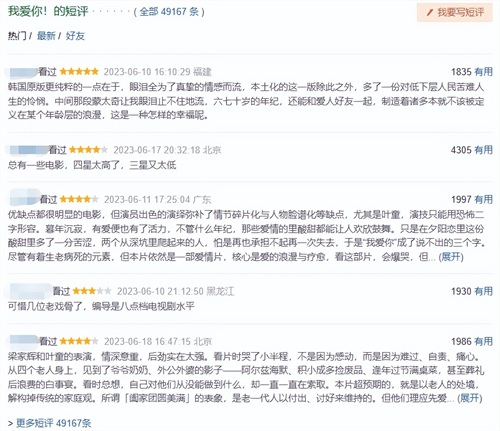 《我爱你》2023 由导演韩延执导,说起这位大导演相信大家都熟悉,旗下颇为周知的有《人生大事》《送你一朵小红花》《动物世界》等均相当爆红。本次这部新片主演有倪大红,惠英红,梁家辉,叶童,成果等一众大人物,老戏骨果然还是老戏骨,演技方面无人能及,特别是叶童,表情管理和细节处理都堪称巅峰。本次故事改编自韩国同名漫画,讲述了四位老年人在人生终章中勇敢表达爱意的感人故事。网上评论+感悟均一致好评,大受欢迎。目前网上已经有高清资源,可下载可在线观看。