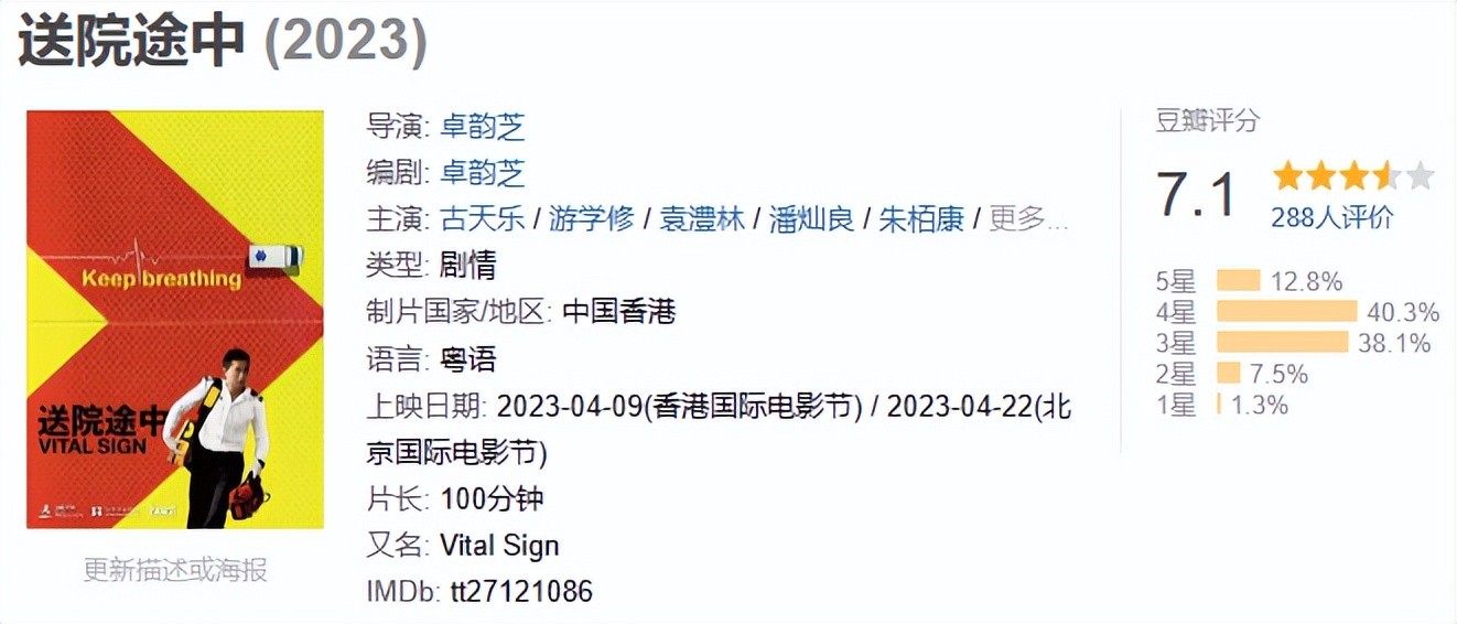 《送院途中》由导演卓韵芝执导,这位女性导演并没有太多的突出作品,但这部也算是她出名的封后之作了。主演由古天乐,游学修,袁澧林,潘灿良,朱栢康等,相信大家也不会过多犹豫,有古天乐的作品就肯定一睹芳容了,虽然说古仔烂片也相当多,但总有那么一部是吸引到你的,就例如这部,演技很在线,古仔这种老司机完完全全随手拿捏。影片以救护员题材展开,这也是一个相当比较老套,剧情方面更不拖泥带水,步步紧逼。此片网上也还没有资源,想要观看还是要等资源上线,难搞哦。