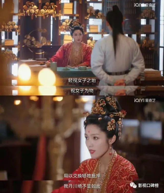 先进的女性观暂可分为两部分。第一点就是丹川和霁川的存在。丹川的地理位置其实对应的是四川重庆那一块儿,极爱吃辣,女子当家,那边的男子一般入赘。这只在第一集开头用寥寥两句带过,当看到五少主、六少主、李薇一同去丹川,请求郡主上官婧回新川的剧情时,才能真正感受到那边的女性地位。
