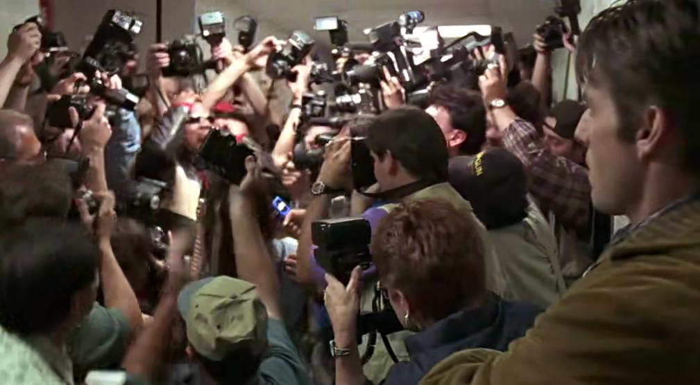 电影在开头用了一个接着一个明星被镁光灯追拍的混乱场面,引出了杰瑞的职业。