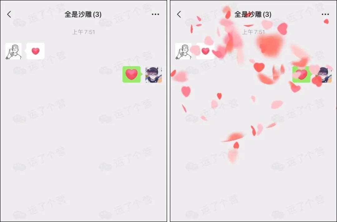 这个“爱心”彩蛋还支持在微信群里接龙,当有多个群友间隔发出“爱心”表情时,这个彩蛋可以一直持续。