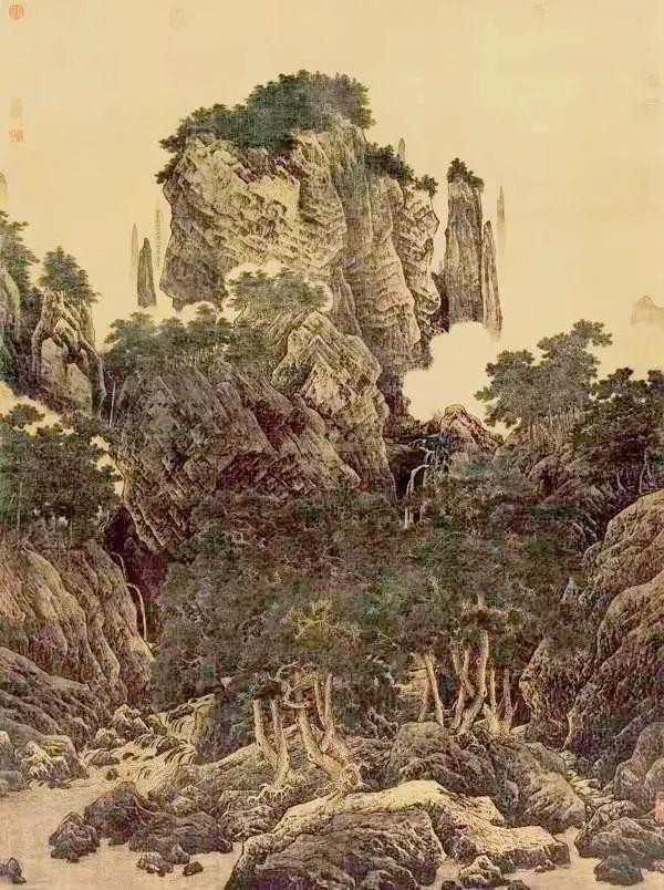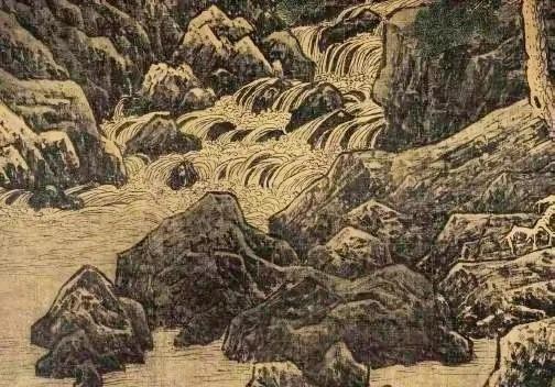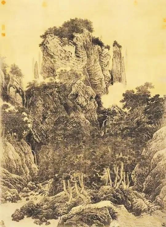 《万壑松风图》是李唐的代表作,画中奇峰耸立,险峻巍峨,山腰处白云朵朵,山巅的丛树,近树的松林,时隐时现的石径,还有瀑布一线垂下,几折之后,转成一滩溪涧,涧水穿石而过,如闻声响,诗意深浓。