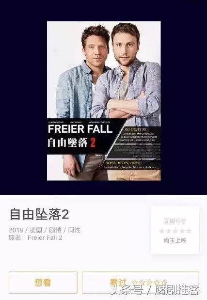 这是一部2013年的德国同性电影——《自由坠落》是由斯蒂芬·拉坎特执导,马克思·雷迈特、汉诺·科弗勒等主演。该片讲述36岁的防暴警察马克的故事,他有一个女友,并且即将为人父,但他情不自禁的爱上了英俊的警察同事凯。马克在熟悉的旧世界和刺激的新体验中间难以决断,最终让一切失控。