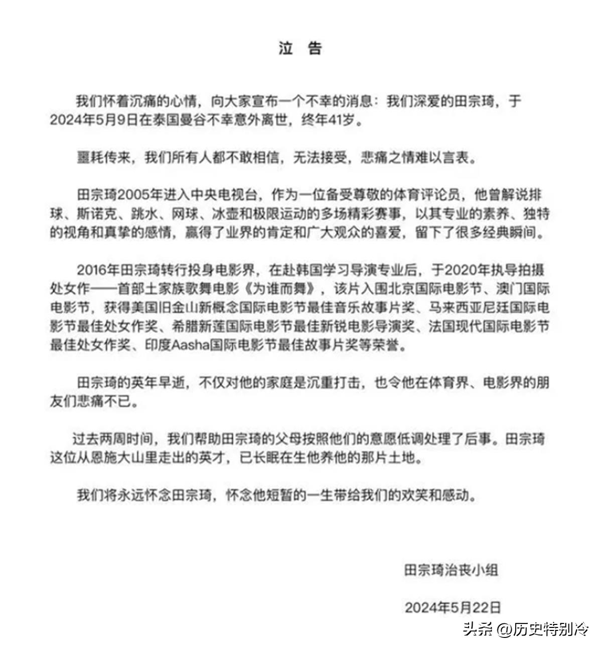 根据治丧小组发布的讣告内容来看,田宗琦去世年龄为41岁,且在过去的两周低调处理了后事。