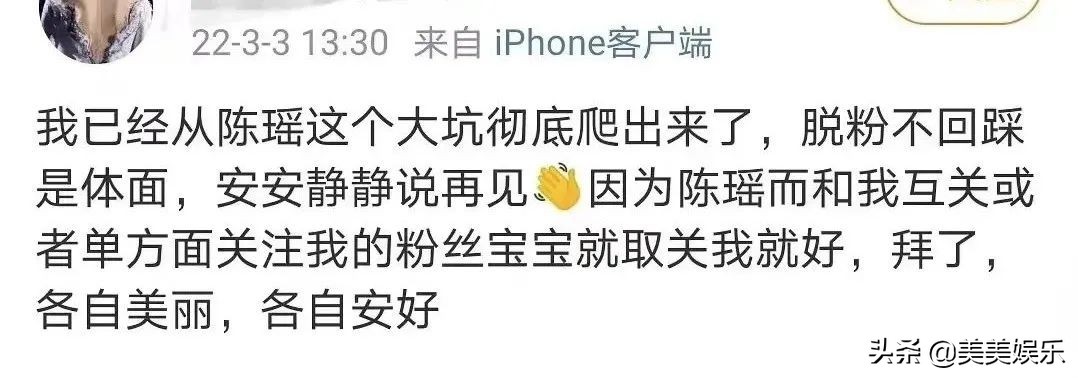 陈瑶站姐突然宣布脱粉,还表示脱粉不回踩是为了给大家体面,因为陈瑶而关注她的人可以取关,话说的非常决绝。