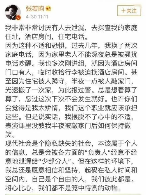 李现好友演员张若昀也被私生跟踪一事困扰过,信息被泄露,家人被骚扰,半夜无故被人敲门,甚至严重到深夜光速搬家等等这类过激行为。