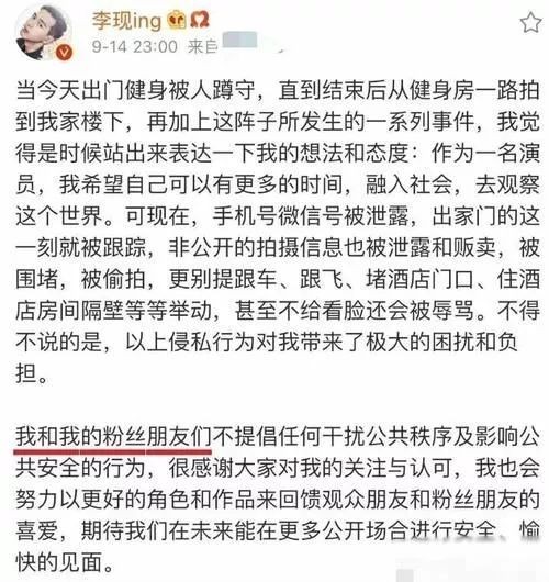 “现男友”李现几天前也在微博发长文称自己近段时间被私生饭骚扰,给他带来了极大的困扰和负担。