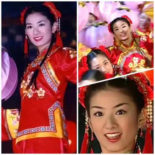 也不得不说黄奕以上这个喜庆的造型设计显得比较大众化了,像过新年时小女孩的穿着大红色的新年新衣服了,发型也是如此,和其他群演的舞女穿着打扮是一样的。