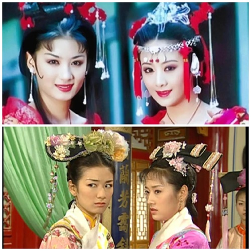 以上这组靓照图,都是上错花轿嫁对郎和还珠三的女主和女配的对比照,我个人还是觉得上错花轿嫁对郎里面的造型和服饰更好看,当然都不是一个朝代的服饰了,完全不是一个类型。