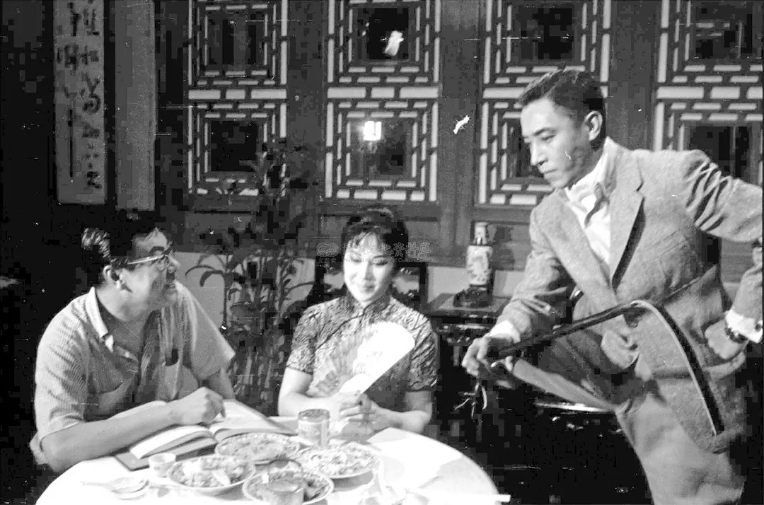 李翰祥(左)在电影《扬子江风云》(1969)拍摄现场指导李丽华和杨群(右)