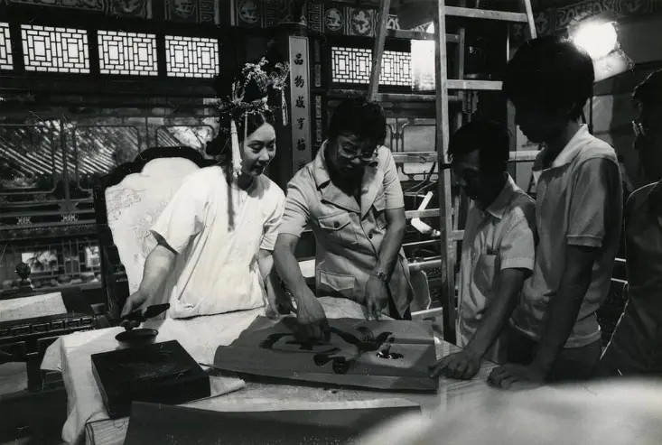 李翰祥在电影《金玉良缘红楼梦》(1977)的拍摄现场指导宝玉的扮演者林青霞