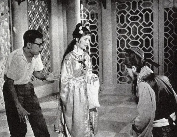 李翰祥在电影《梁山伯与祝英台》(1963)拍摄现场,指导凌波(右)和乐蒂(后左)。